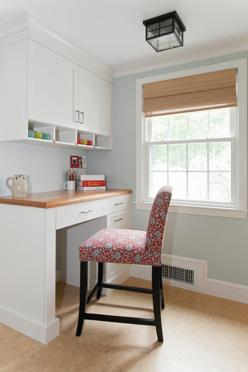 In this home office the paint color really takes a back seat and is much more subdued. You hardly even notice it with all the other things going on.